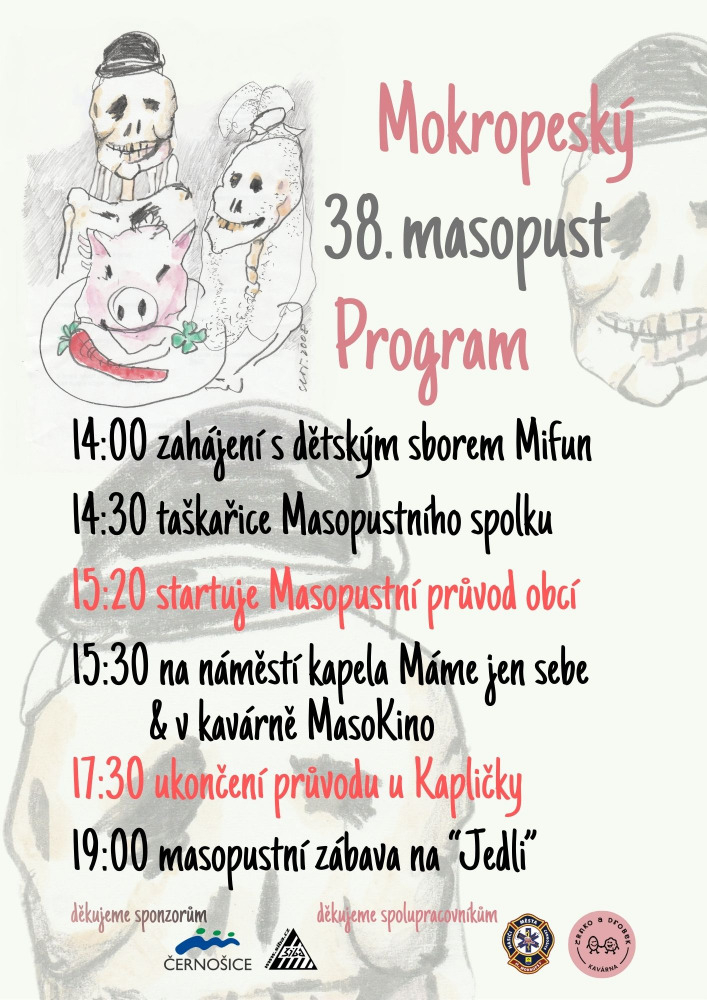Stránky našeho spolku jsou právě v rekonstrukci. Více informací o plánovaných akcích se dozvíte níže. NAŠE UDÁLOSTI Program 38. Mokropeského masopustu 14:00 Zahájení s dětským sborem Mifun14:30 Taškařice Masopustního spolku15:20 Startuje Masopustní průvod obcí15:30 na náměstí: kapela Máme jen sebe v kavárně: MasoKino17:30 ukončení průvodu u Kapličky19:00 zábava v restauraci Jedličkovy Lázně o nás fotoalbum naši sponzoři